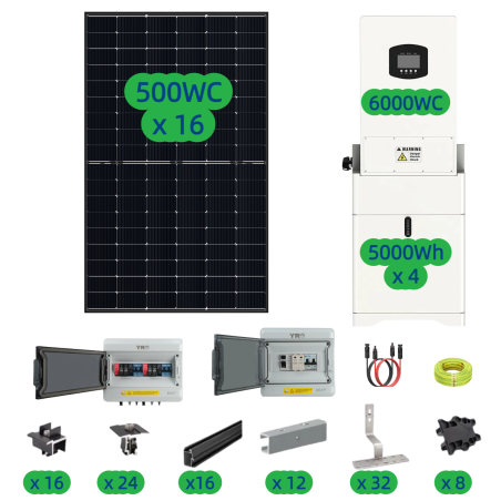 Ce kit solaire 8KWc, comprenant 16 panneaux solaires de 500 Wc, un onduleur hybride 6 kW et une batterie 20 kWh, propose une solution complète et performante pour produire et stocker une énergie propre en France.